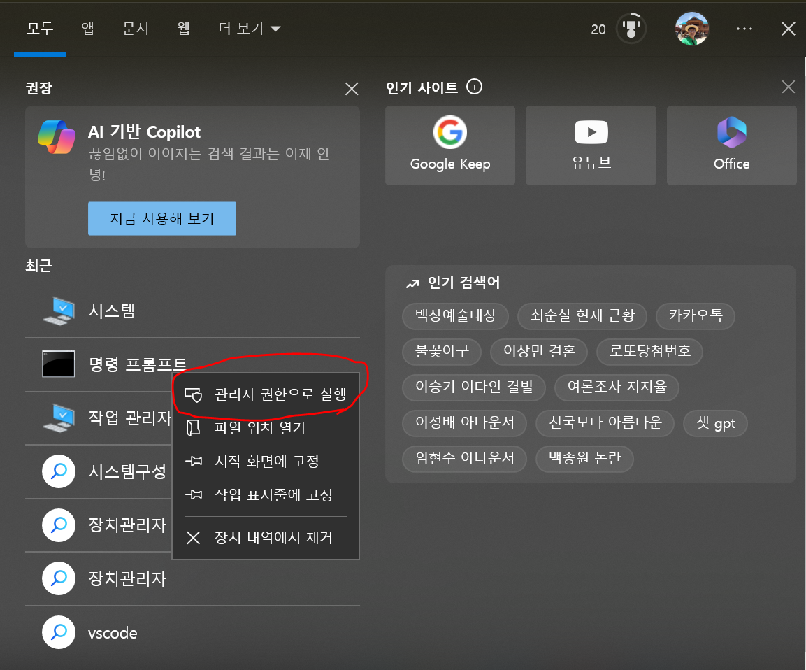참고로 작업창은 "명령 프롬프트 관리자 권한으로 실행"