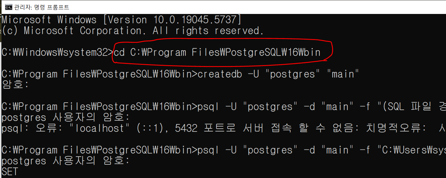 C:\Program Files\PostgreSQL\16\bin>psql -U "postgres" -d "main" -f "(SQL 파일 경로)"