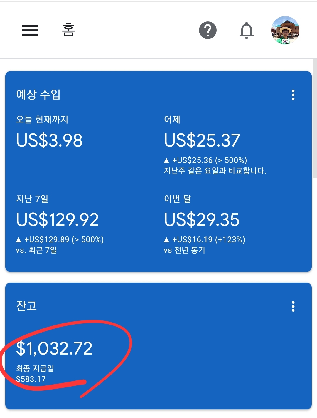 바로 오늘자 애드센스 수익현황입니다.