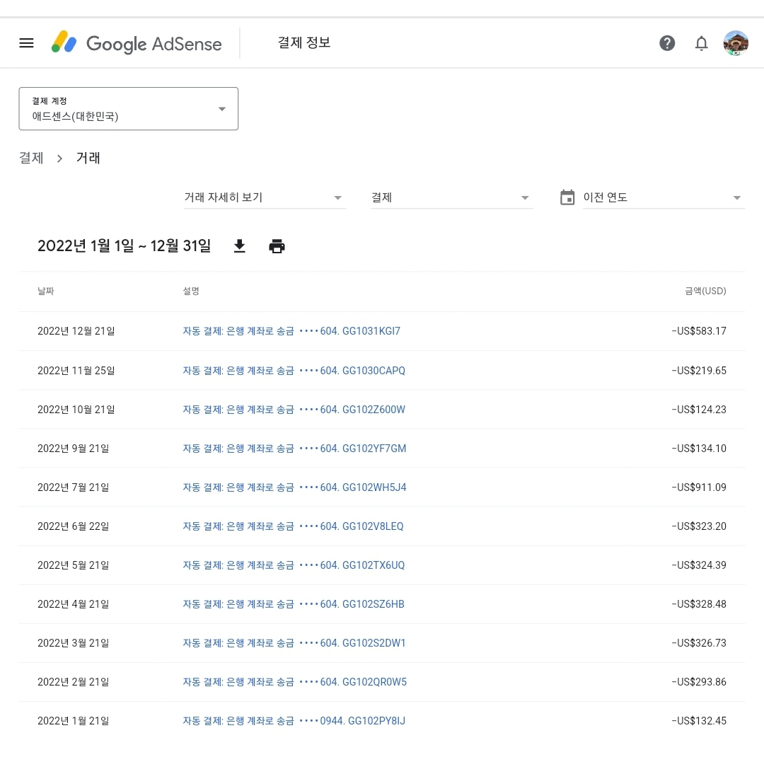 애드센스 2022년 최종 수익결산