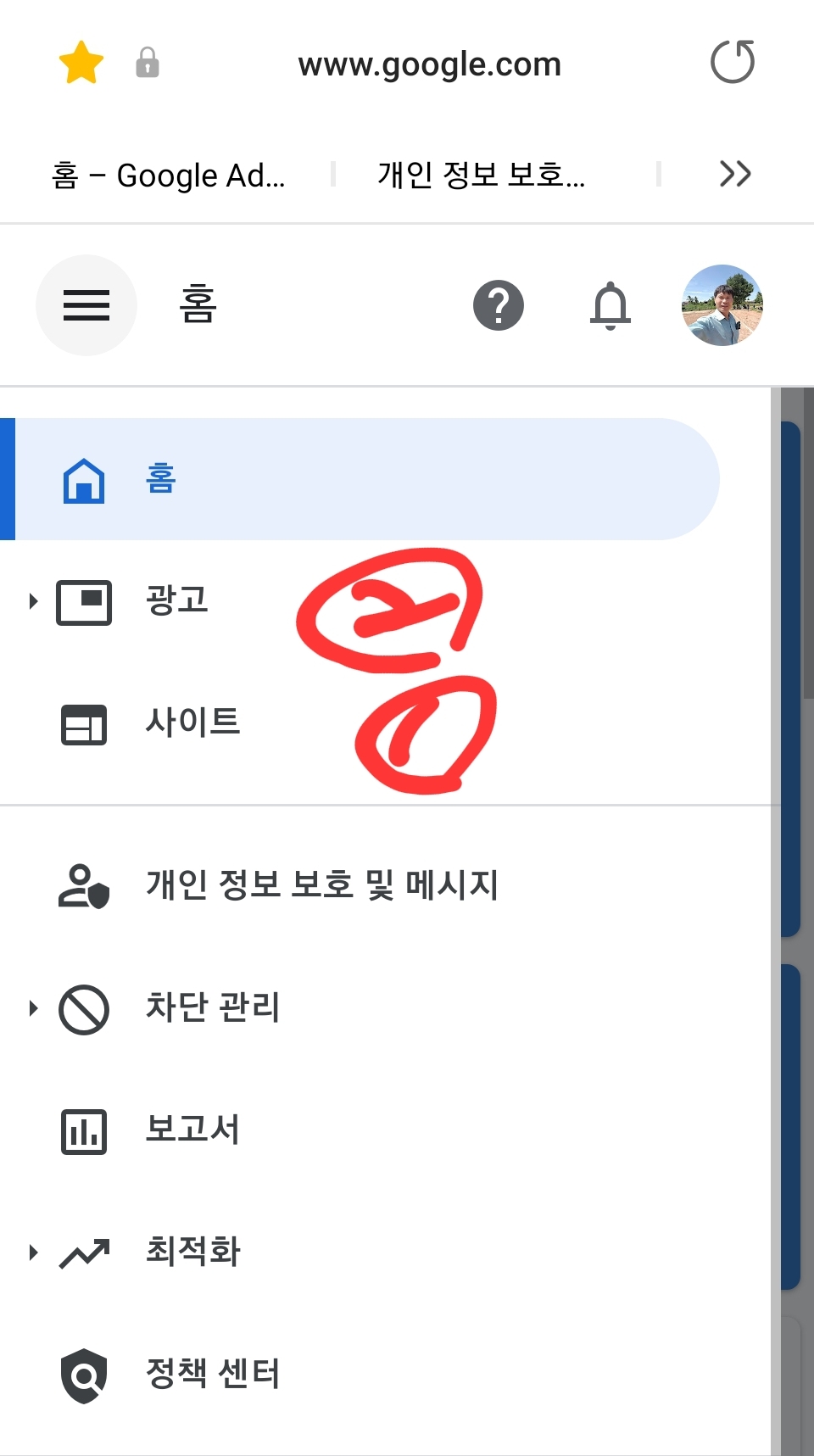 먼저 애드센스 홈 로그인하셔서 홈을 클릭하시면 메뉴가 나옵니다.
