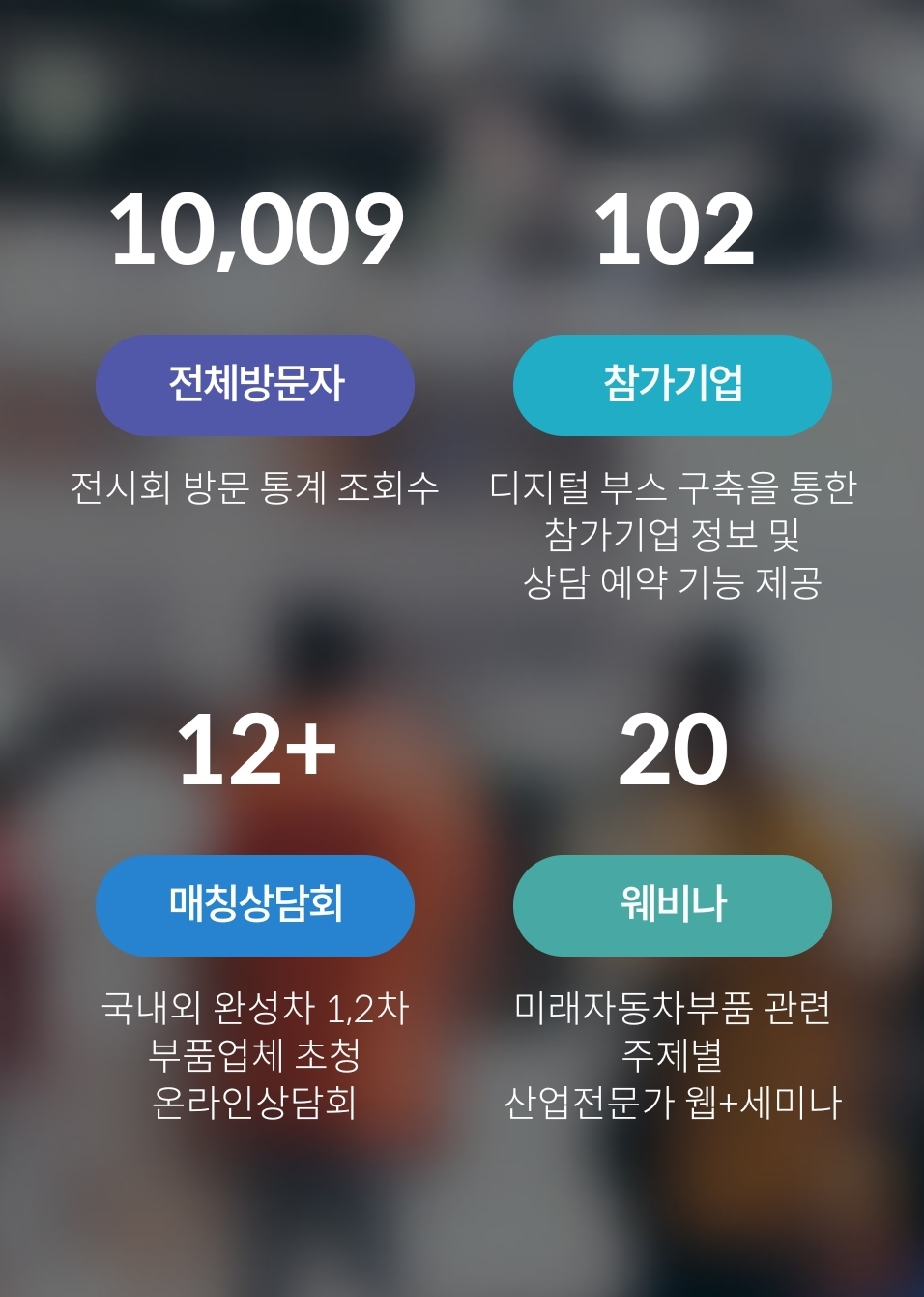코로나19 확산으로 수출 채널 차단 등의 위기에 직면한 미래자동차 부품산업 기업들의 수출 활로 모색에 나섭니다. 디지털 부스 운영, 수출상담회 및 웨비나 등 다양한 프로그램을 통해 미래차 부품산업 수출실적 향상, 정보공유 및 한국판 뉴딜 정책 대응에 힘을 보태겠습니다. 이번 엑스포는 온라인 무역 전시회를 통해 신규 시장 개척, 매출 다변화 등 수출효과를 창출 할 수있는 활로가 될 것입니다.